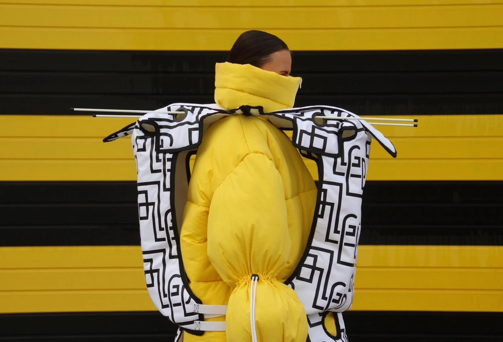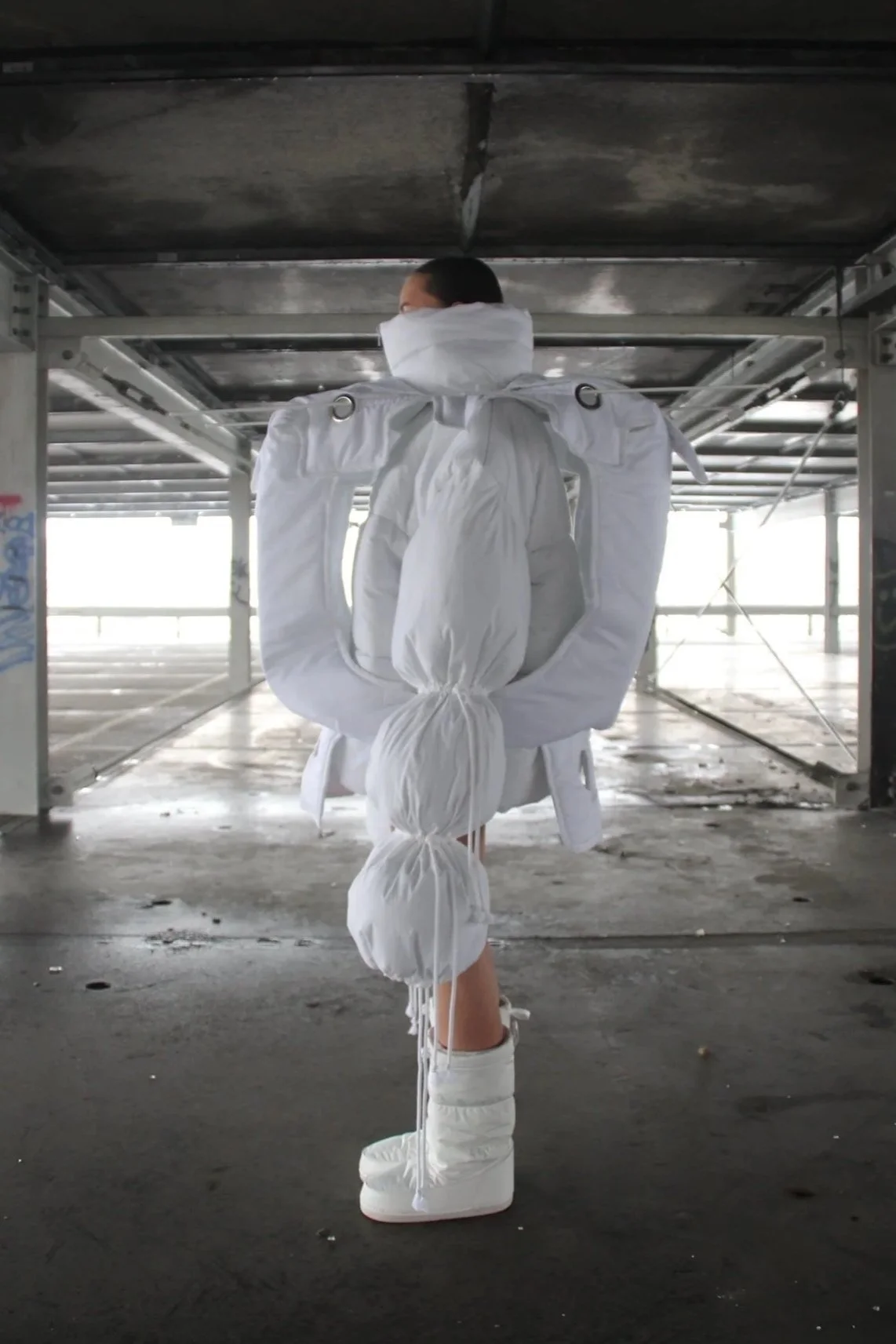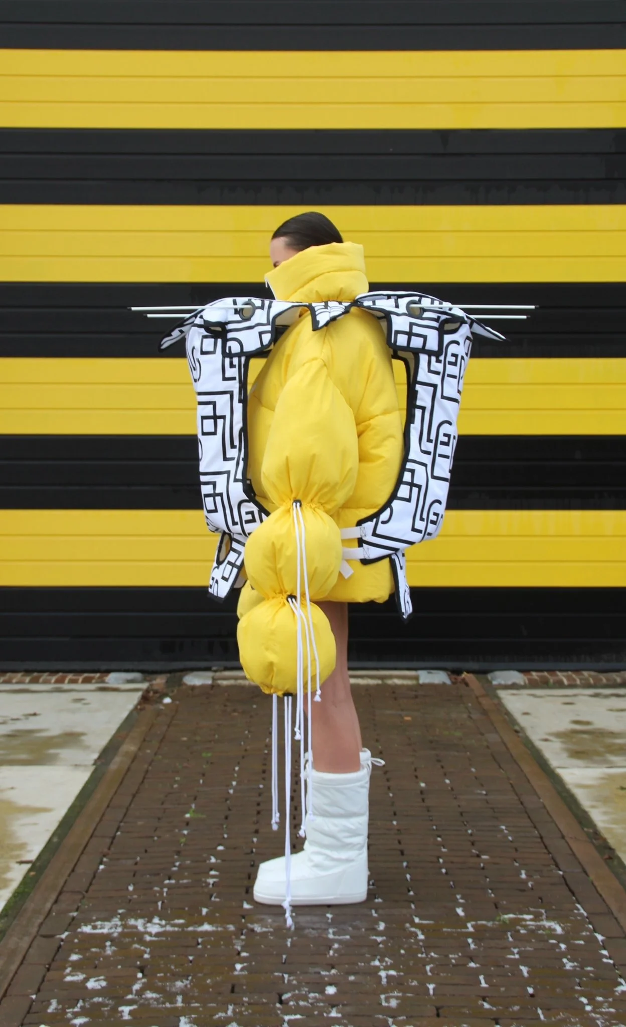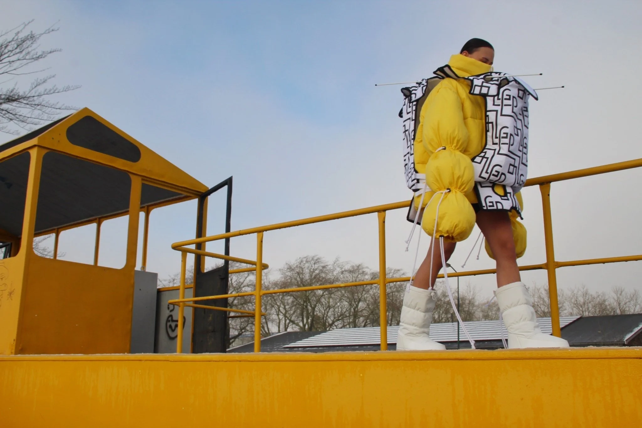 Creating new silhouettes without the limitations of a brand or the market allowed me to explore my own vision of the relationship between form, material, construction, and the body. To develop the patterns for this silhouette, I unfolded a cardboard box originally used as packaging for Chocomel cans and scaled it up. By comparing the white version to the colored one, you can clearly see how color and print influence the final design.