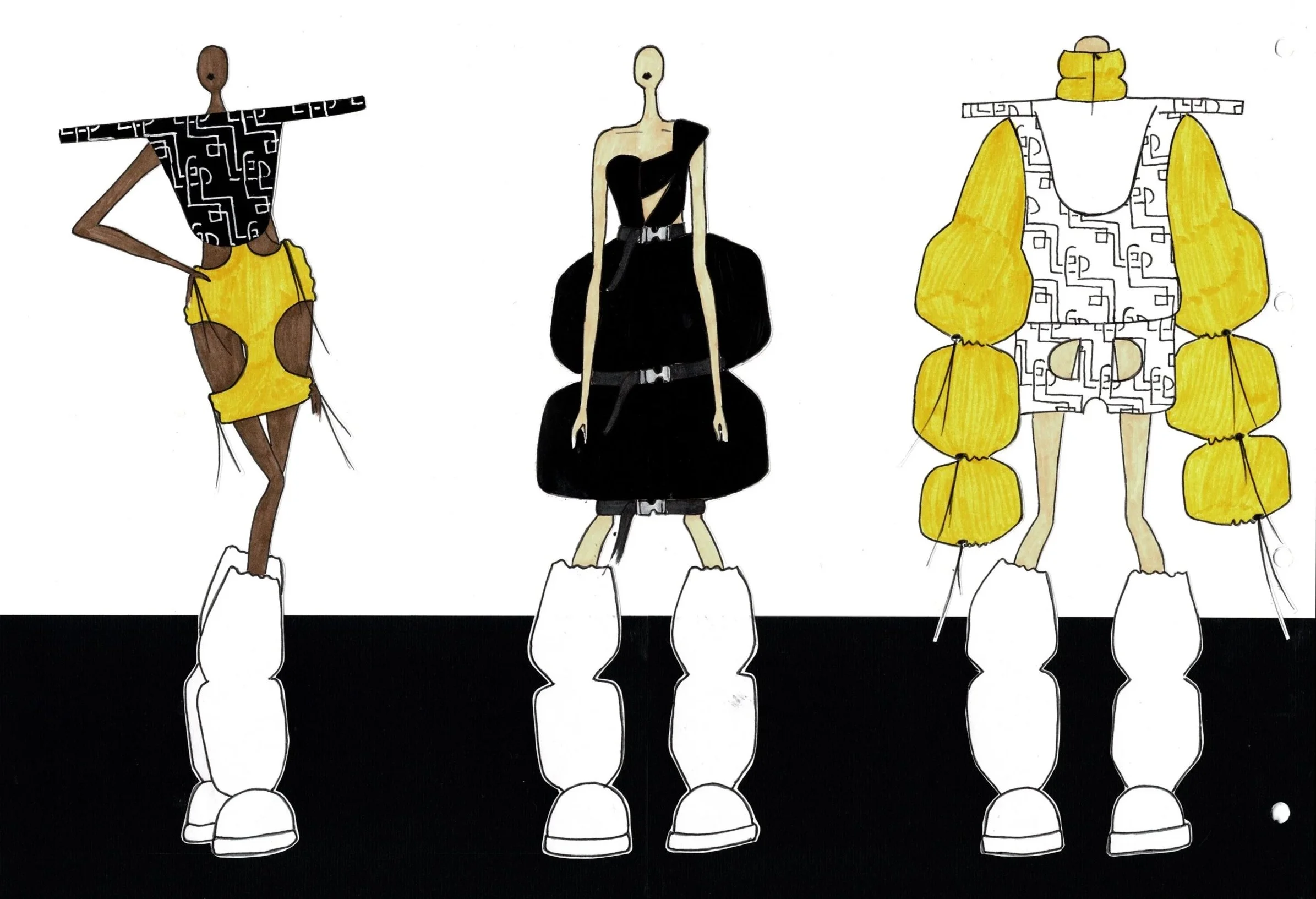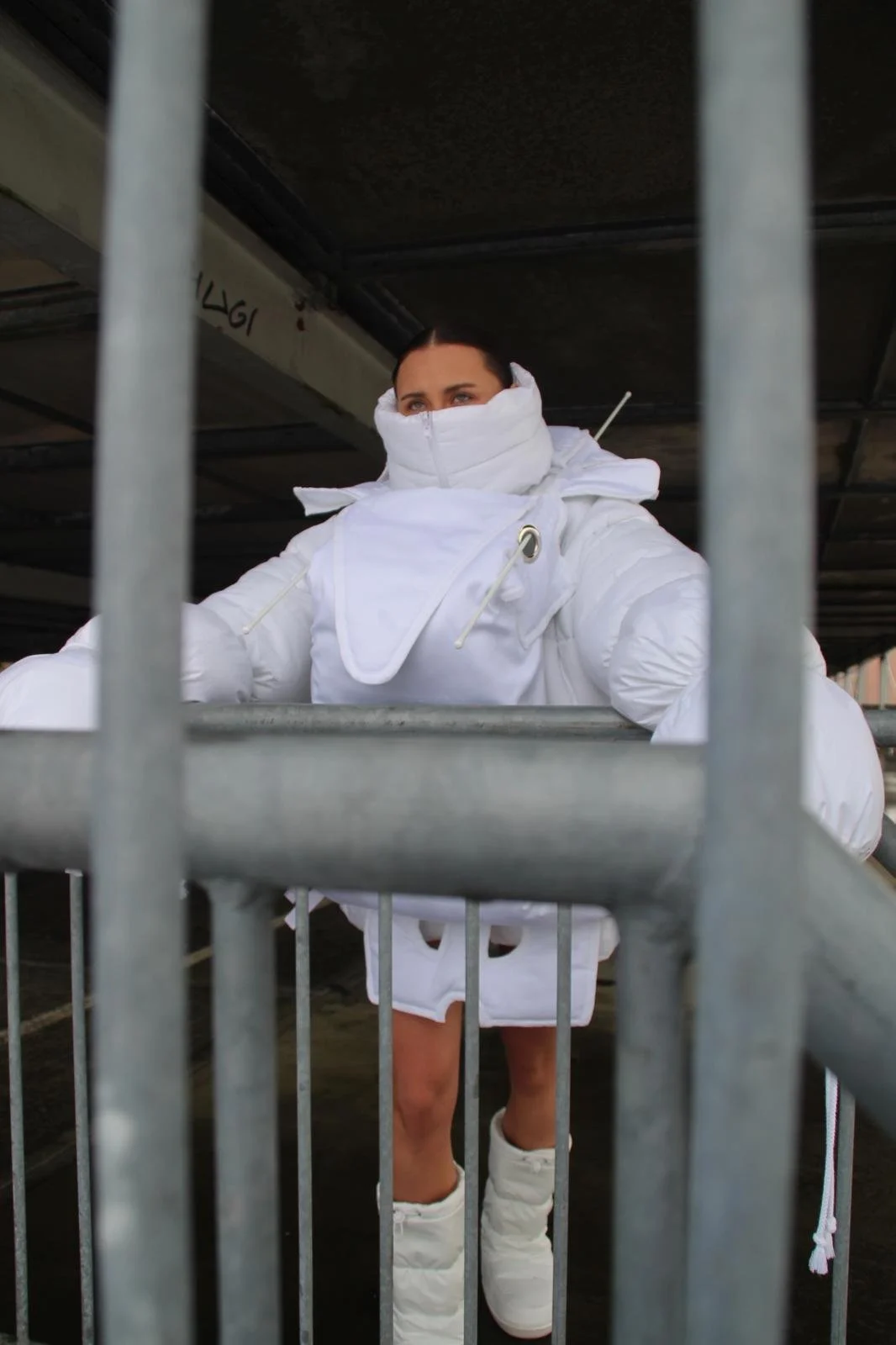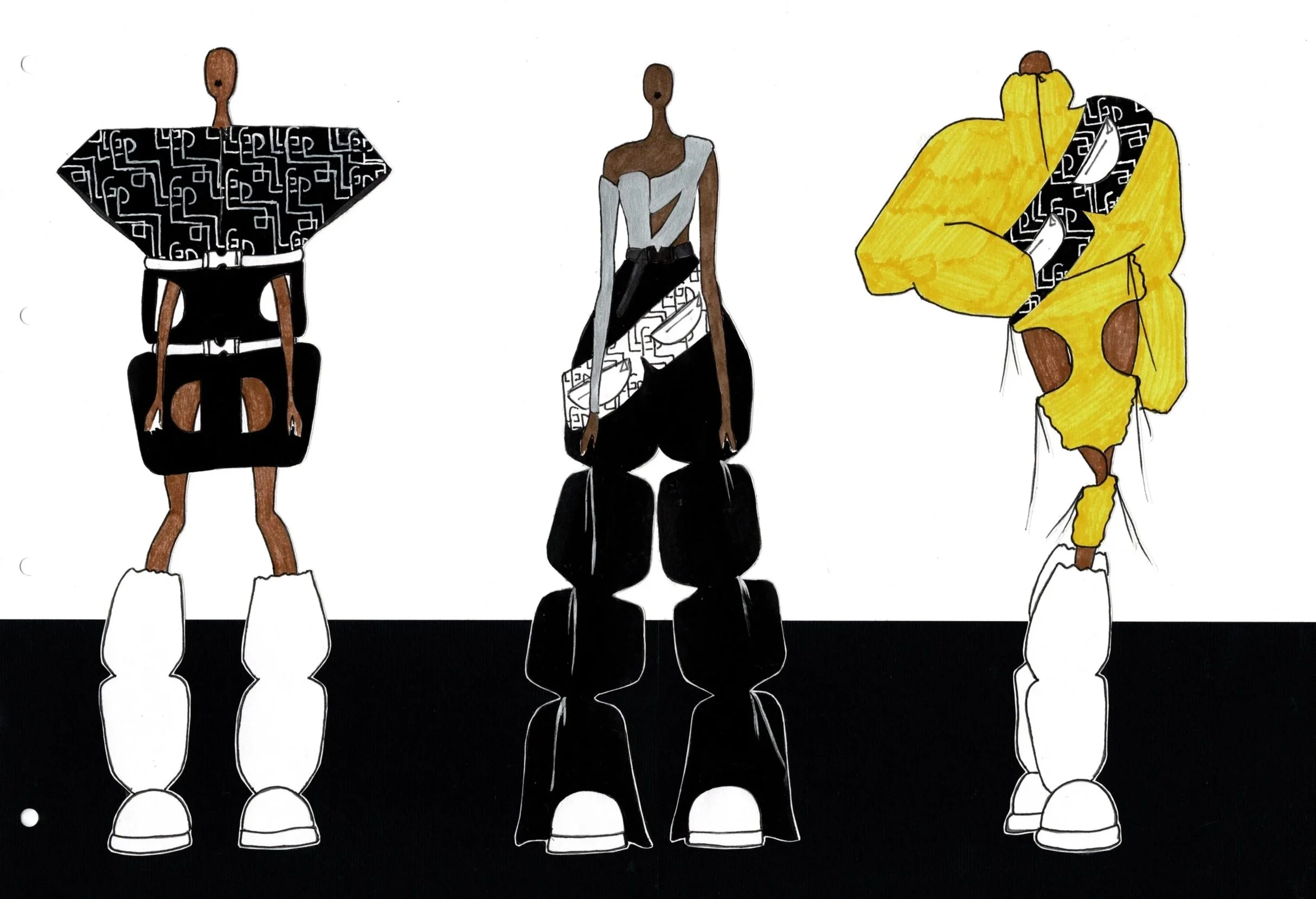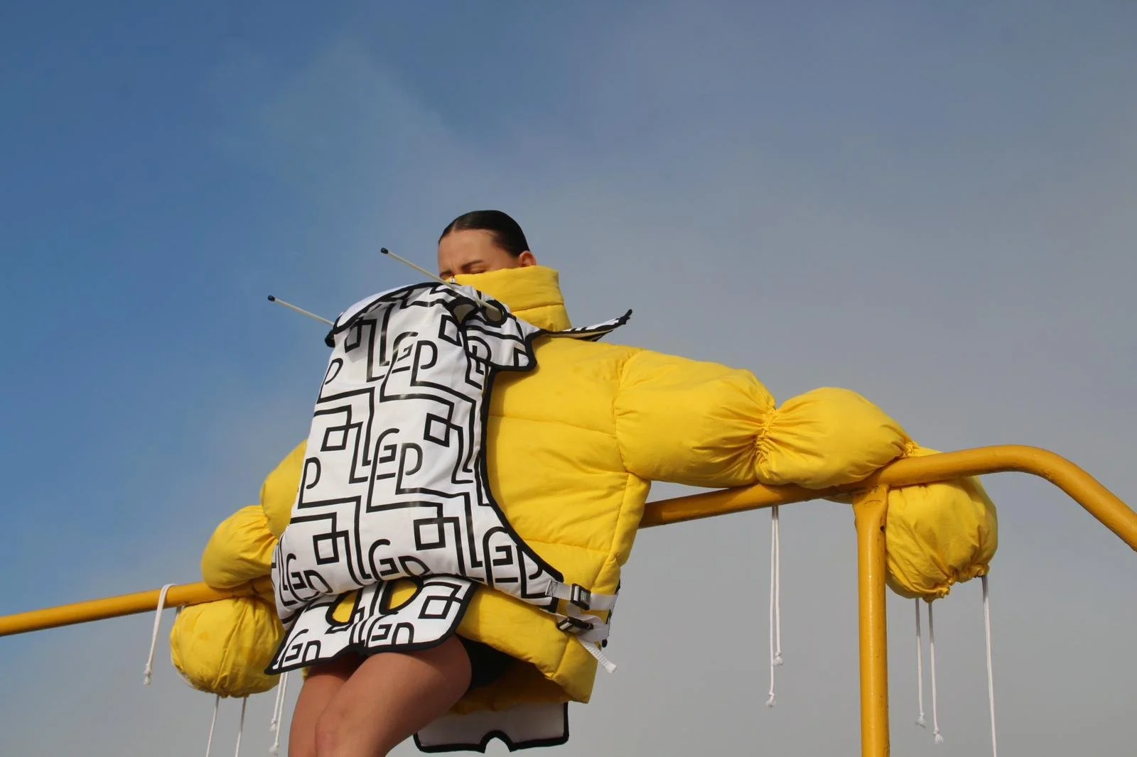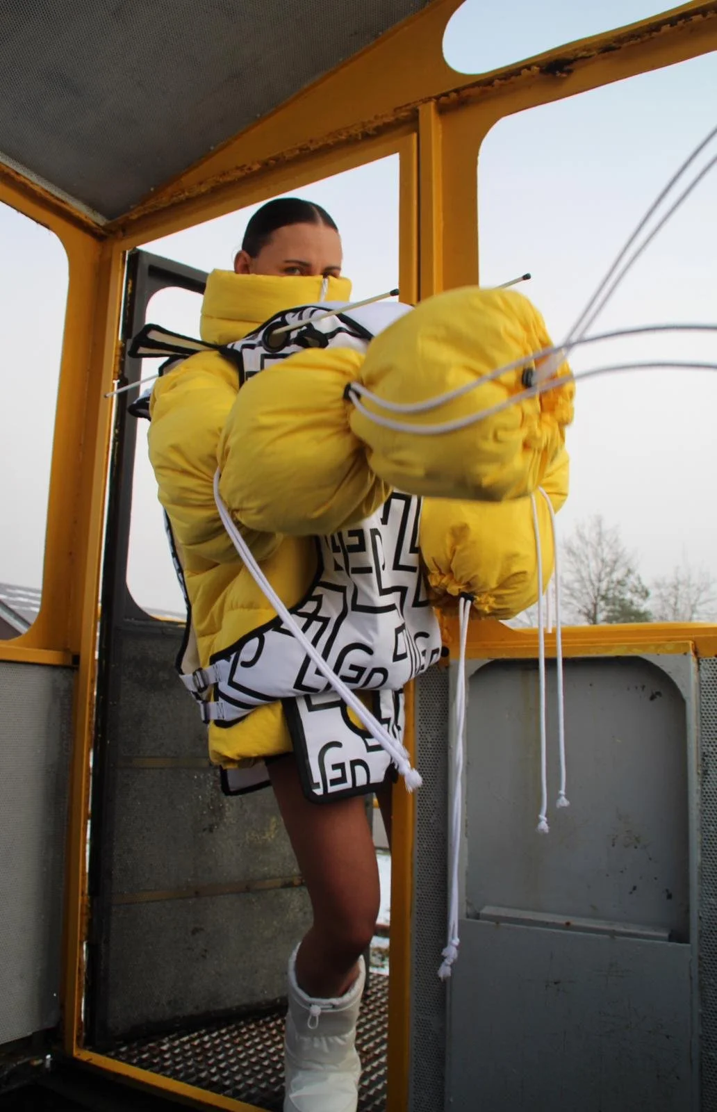 Creating new silhouettes without the limitations of a brand or the market allowed me to explore my own vision of the relationship between form, material, construction, and the body. To develop the patterns for this silhouette, I unfolded a cardboard box originally used as packaging for Chocomel cans and scaled it up. By comparing the white version to the colored one, you can clearly see how color and print influence the final design.